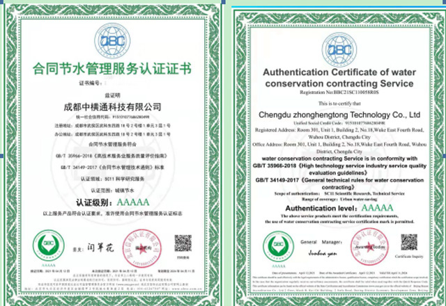 經(jīng)審查復(fù)核、認(rèn)證評定、批準(zhǔn)注冊,2021年4月12日,成都中橫通科技有限公司成功獲得《合同節(jié)水管理服務(wù)認(rèn)證證書》!